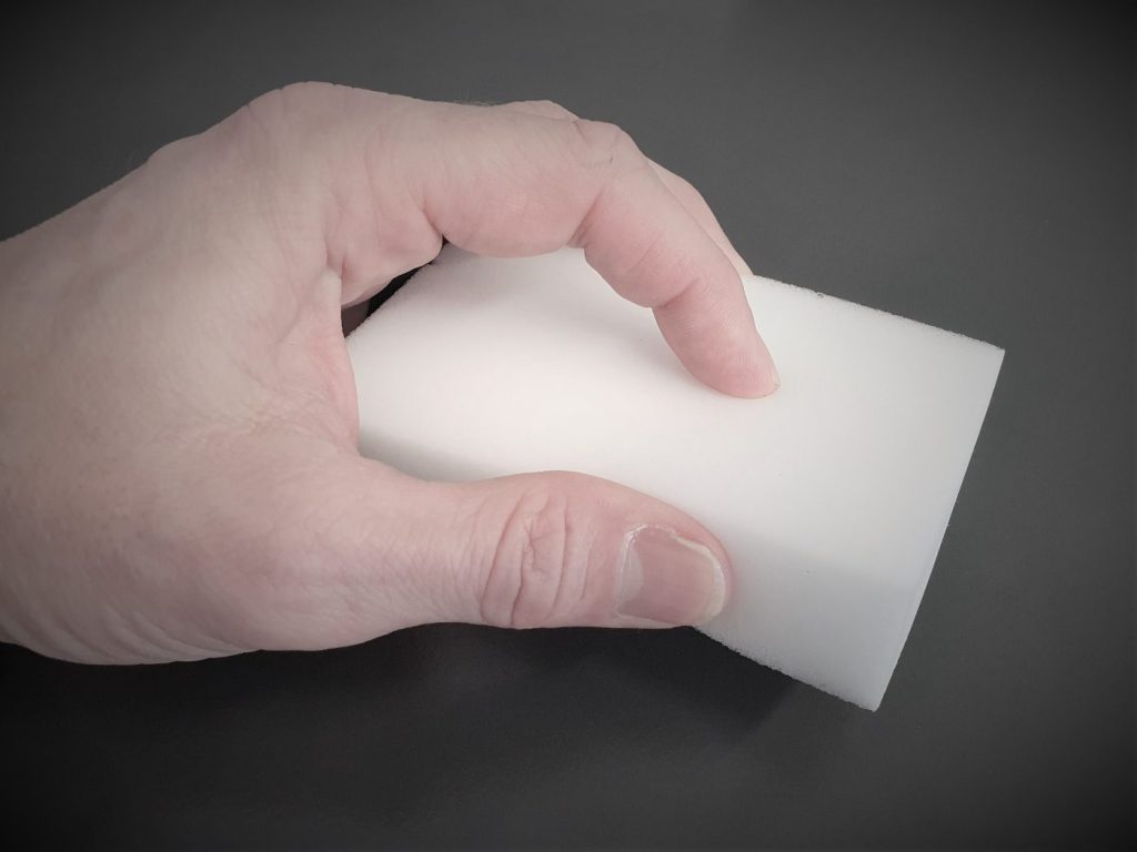 In addition to its aforementioned qualities, Basotect is also excellent for cleaning purposes. The foam material acts as fine sandpaper, effortlessly removing stubborn stains from various hard surfaces. It is effective in cleaning whiteboards, removing black scuff marks from floors, or getting rid of pen and marker stains from tables and other hard surfaces.