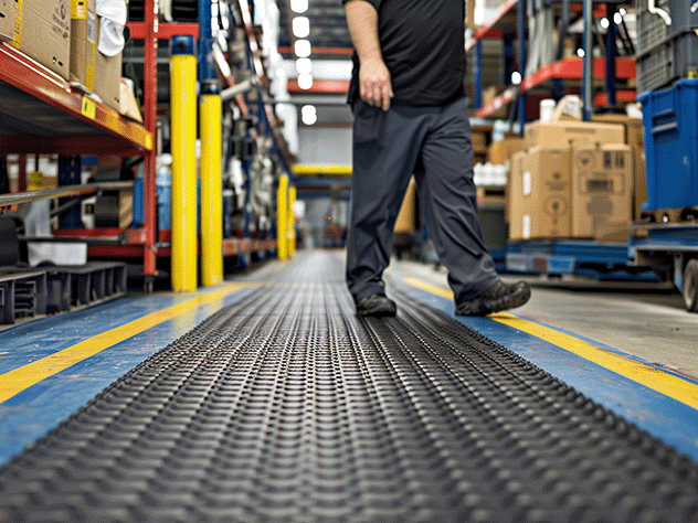 Ergonomic rubber mats and work mats for industrial workstations and production lines. Non-slip and durable surfaces designed to relieve employees, reduce injuries and fatigue, while also dampening noise in production areas and workshops.